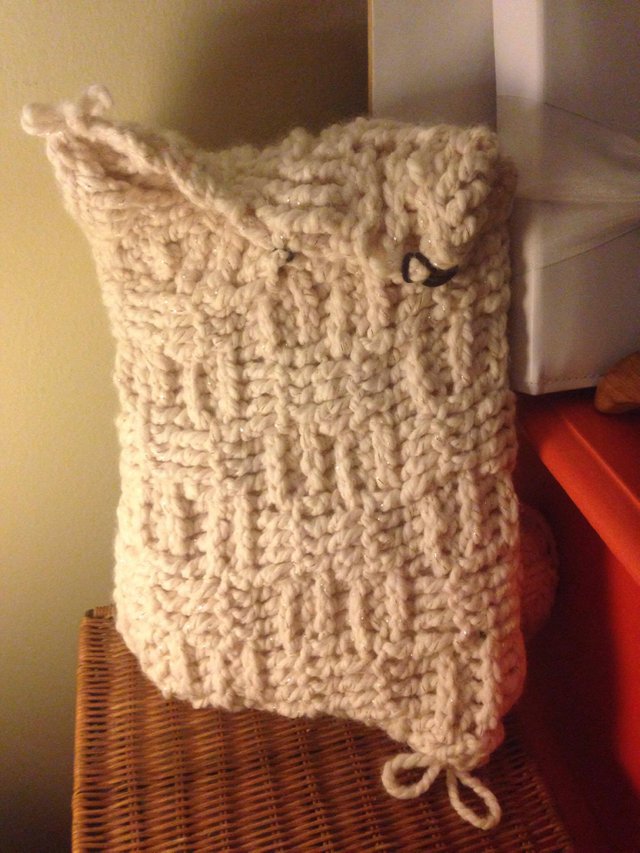 This is the computer inside the BasketCase Sweater. I still need to add either a large button or three or make a large bead or three to add to the top closure. In the photo I've just got two hair ties holding the flap closed.