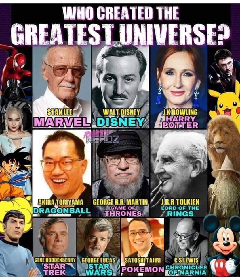 All right, brother, I'm gonna weigh in here. The greatest has definitely got to be Tolkien. While others have taken the reins and expanded the universes of Star Trek, Star Wars, and Marvel (much love to Stan the Man, he was my 2nd pick), Tolkien built the whole of his universe including multiple languages, and he did so in an age that required pure imagination. He crafted his universe using words and drew the readers in with those same words, enticing us to want to journey with Bilbo and the Dwarves to steal back the treasure from Smaug. Tolkien expanded his universe on his own, with no agenda of making bank from it, per se, but rather looking to entertain, delight, educate, and enthrall his audience. He was a wise man and he knew how to tell a story of good and evil, how to craft the words together, and he did all of that on his own. He also maintained a proper series "bible" and was consistent in all that he wrote, not expounding on or expanding after the fact with little tidbits like Harry Potter does, or having some inherent contradictions as found in Star Trek, or have an expanded universe that was canon and is no longer canon as is with Star Wars. His ideas are unique and contain within them the spirit of the human quest, unlike the sanitized fairy tales of Disney (read some of the original fairy tales, there are few happy endings in them). Tolkien established the fantasy genre to allow for the creation of things such as Dungeons and Dragons, and even giving way to George R. R. Martin's work. What remains is Pokémon and Dragonball, and while Pokémon can range from adorable to wicked, that universe lacks the character-driven stories and the depth of lore. And Dragonball... I'm reasonably certain that the whole of the DB/DBZ universe is based on a combination of acid trip and constipation - talking animals, aliens, and the fact that Dragonball and Dragonball Z are massive departures from each other, toss in the absurd martial arts training in gravity that should crush a human being into paté, and have you seen those guys try to power up in DBZ...?