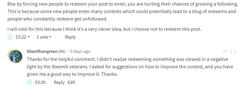 Contestants will upvote (with a minimum 25% upvote power) that weeks contests post.