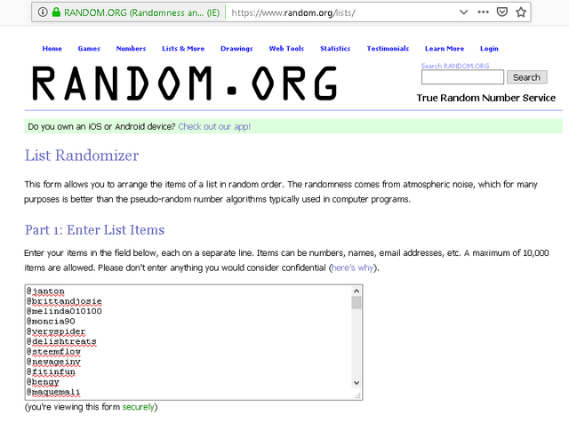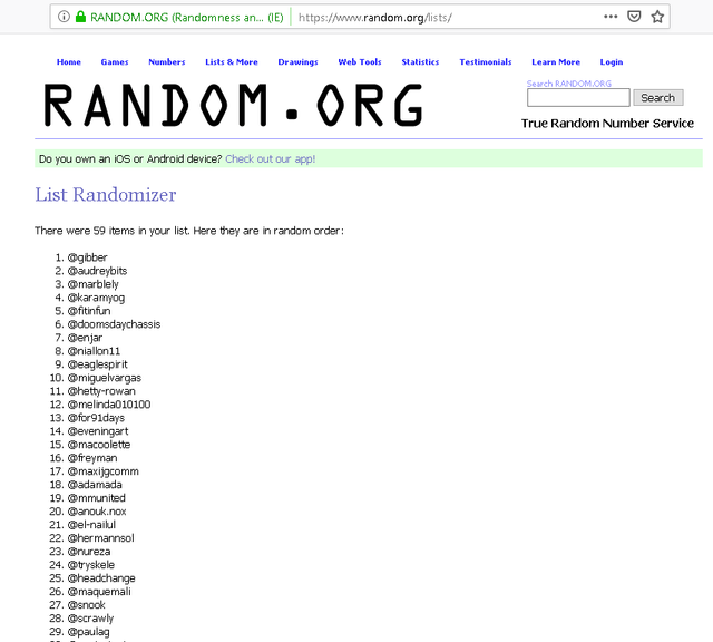 We used https://www.random.org/lists/ to randomize the eligible users. To the left is screencap of total list pasted in, to the right is the new randomized order. The top five results in the new random order are winners.All prizes will be paid out shortly from the @c-squared account