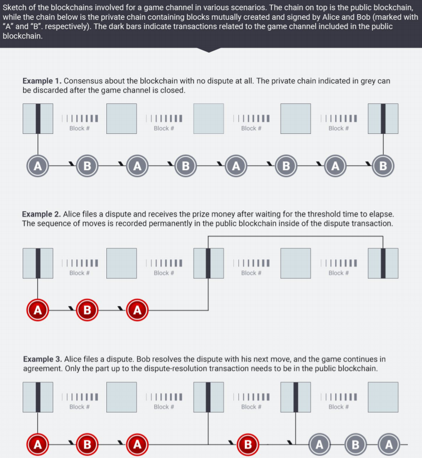 2. Game channels : Game channels facilitates scalability of the platform by registering some of the gaming moves off chain. The final results of the game can be brought back on the blockchain to decide the winner. It is an extension of bitcoin payment channels to support real-time gaming while not overloading the network at the same time.