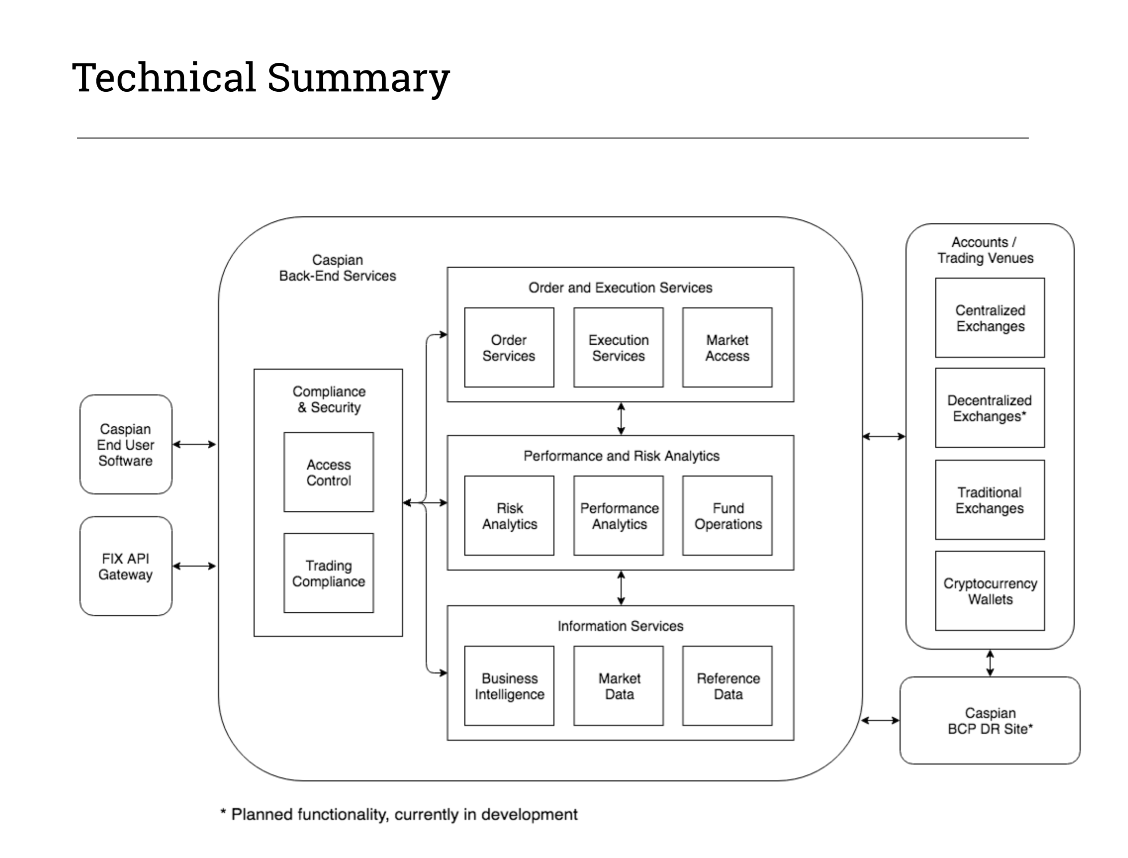 Caspian is a platform based on the cloud and will provide all the contributions you need for your crypto-billboard, it offers you access to all exchanges, and gives you complete software solutions; portfolio, execution order and risk management system with full potential fulfillment supervision, such as counterparty hazard controls and tokens restriction list, as well as being created to work with your existing infra-structure tools.