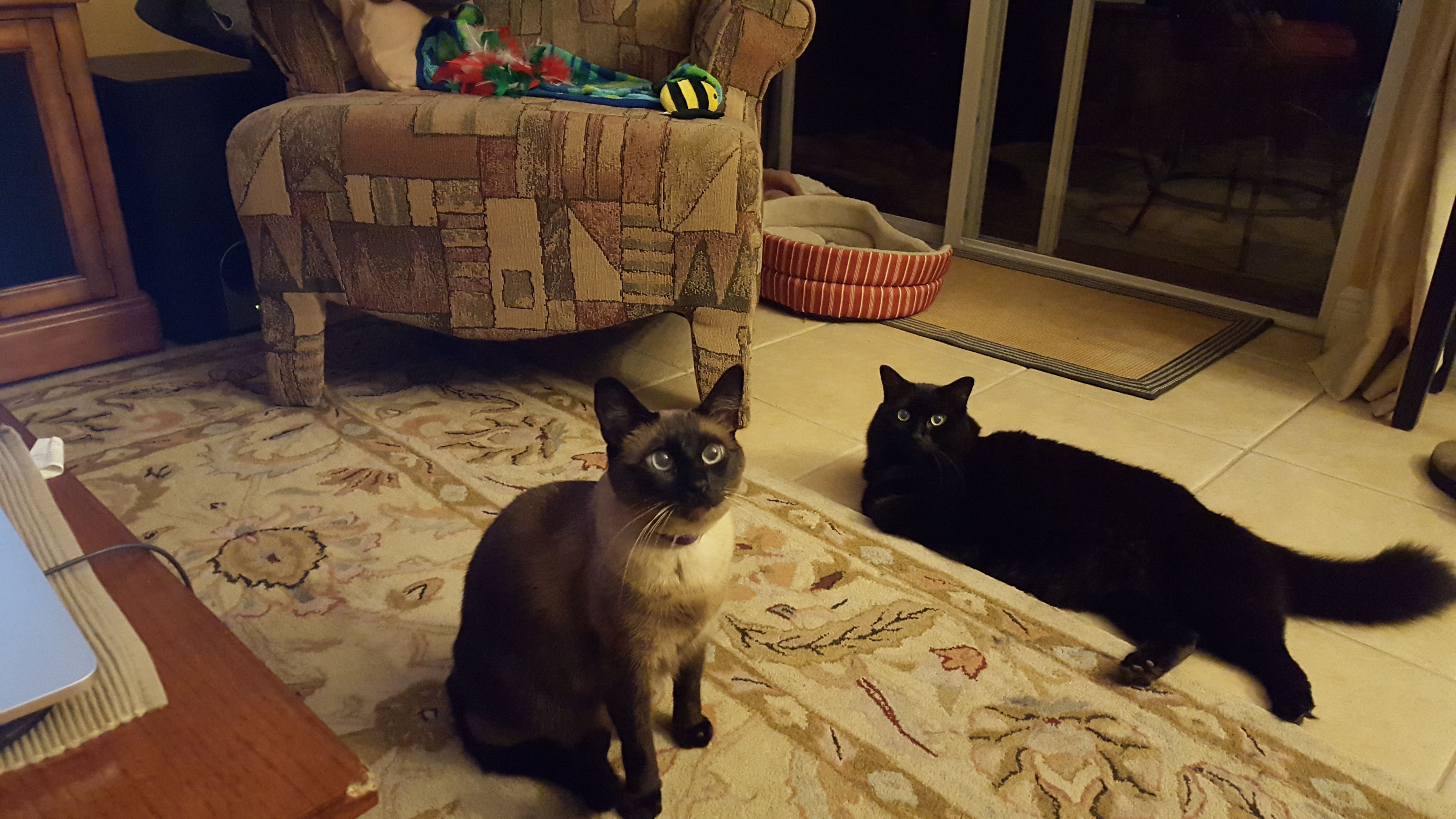 Futomaki is the black fluffy one, and that means "fat roll" which is a kind of sushi roll, and Shoga is the sleek Siamese, and his name is Japanese for "ginger root".