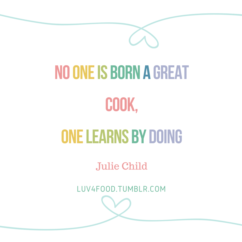 We only learn by trying!maryturquoise (40)in #cooking • 9 years ago “No one is born a great cook, one learns by doing.” Julia Child I totally agree with this motivating cooking quote. Starting to cook isn’t easy, but once you get the hang of it, you will love it. #food #quotes
