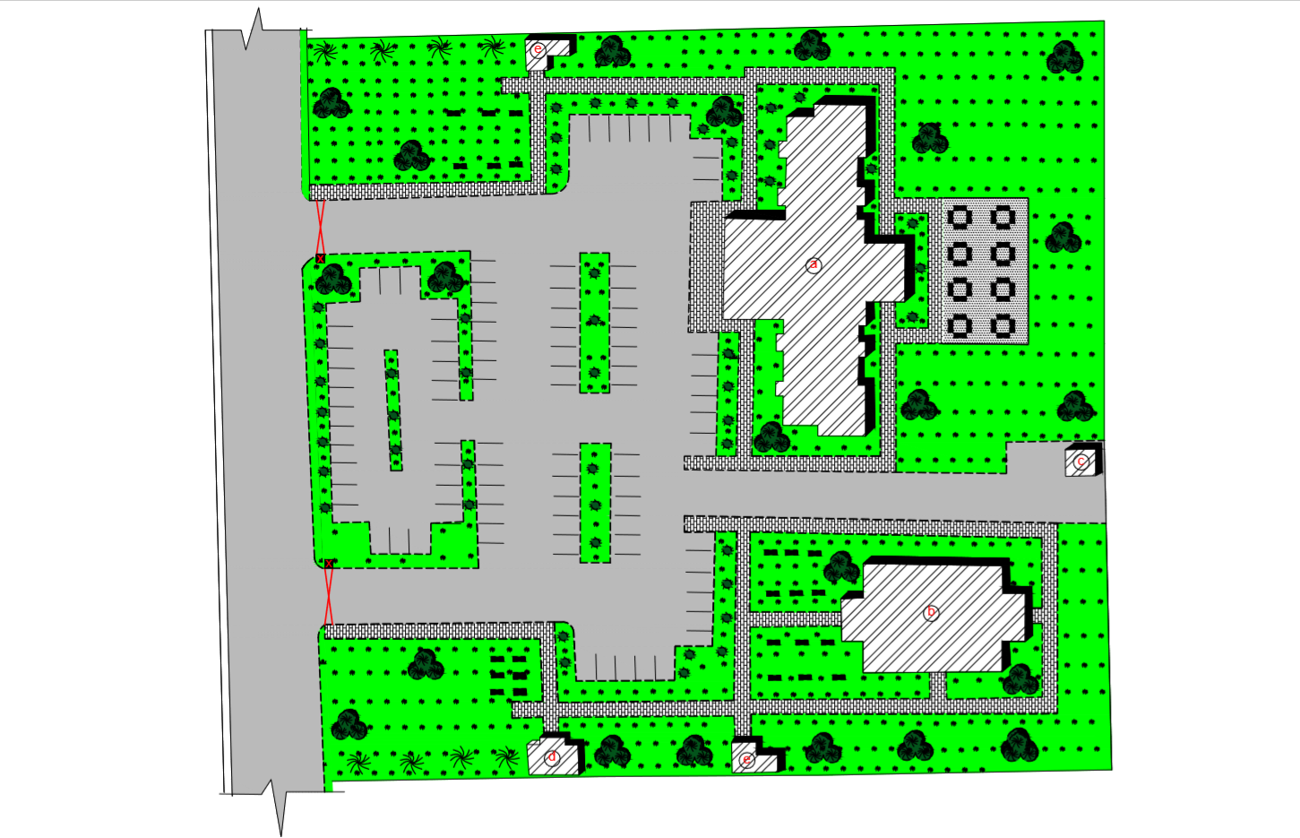On the first day I started with taking photos of the building, designing a landscape plan and then I sketched a building plan for the structure with dimension using the photos as guide so as not to miss physical details of the structure. See photos and plans below...