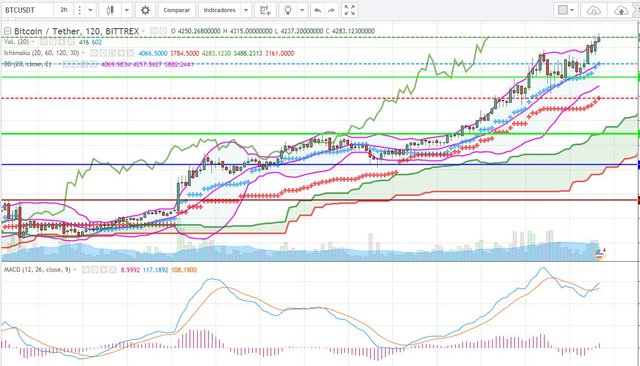 En el caso del marco de tiempo de 2 horas, se puede ver que el MACD se cruza con la linea de señal , en este tiempo el precio toco la linea de 20 pero sin romperla rebotando hacia su máximo por el momento de los 4314usd.