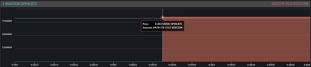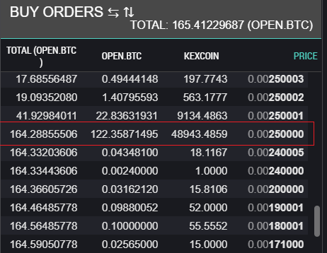 You can see a constant sell order sitting there waiting to eat up any buy order that comes through at the minimum 0.0025 btc. price per kexcoin.