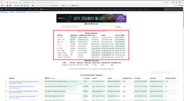 - 클릭하였다면 비트코인을 보유하고 있는 모든 지갑에 얼만큼의 비트코인이 있는지에 대한 통계가 요약되어 나온다.