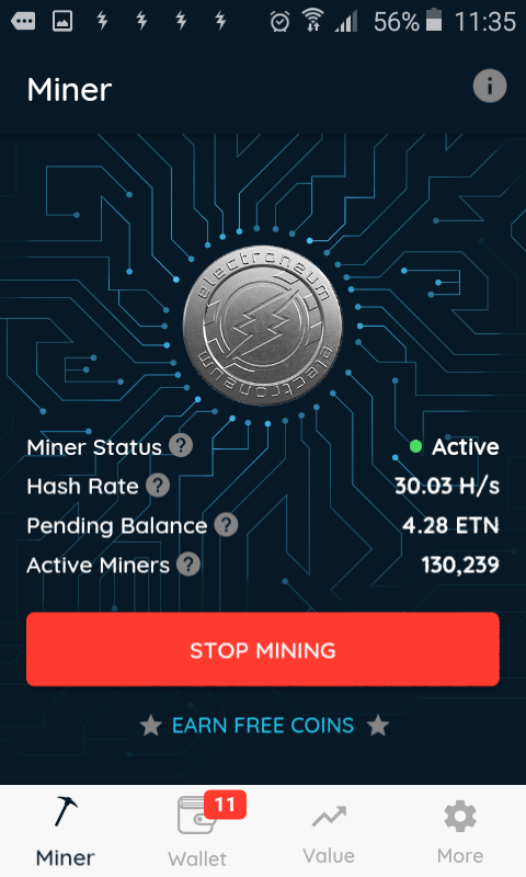Here is a snap shot of the landing page as you can see I am currently mining. You will need an internet connection for this and the cellphone may consume a little more battery, no 'biggie' in my book.
