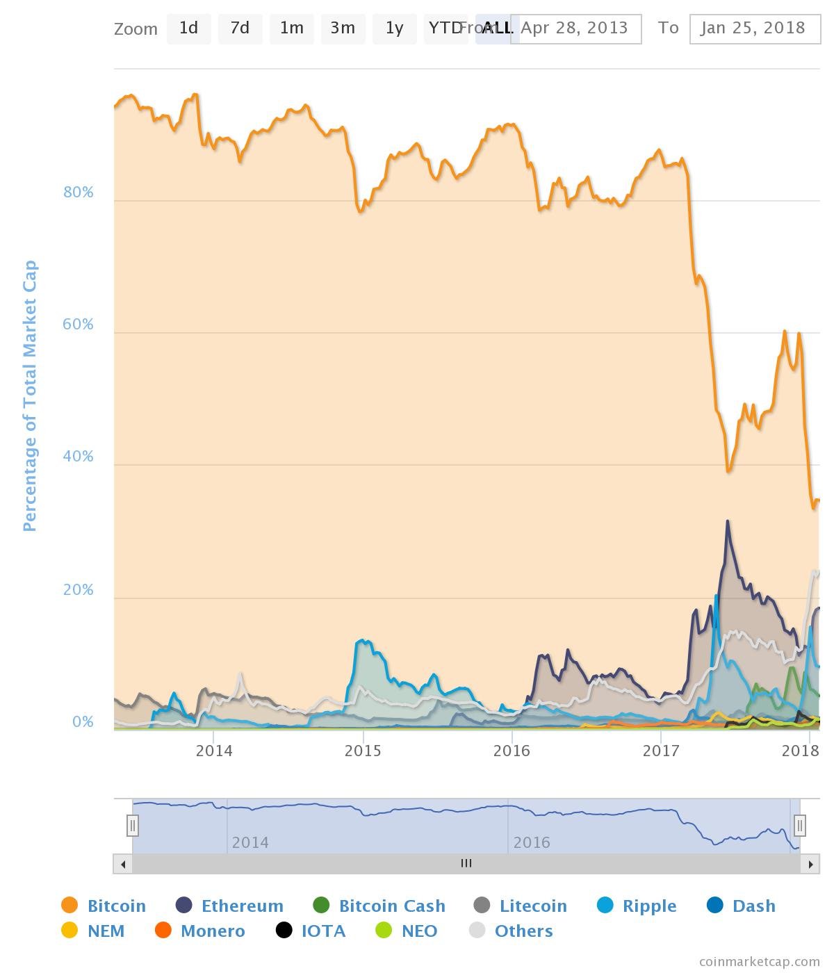 Market cap isn't the only figure to consider for the direction of the crypto market as a whole. The weight each coin carries, based on market cap, is reflected in this chart: