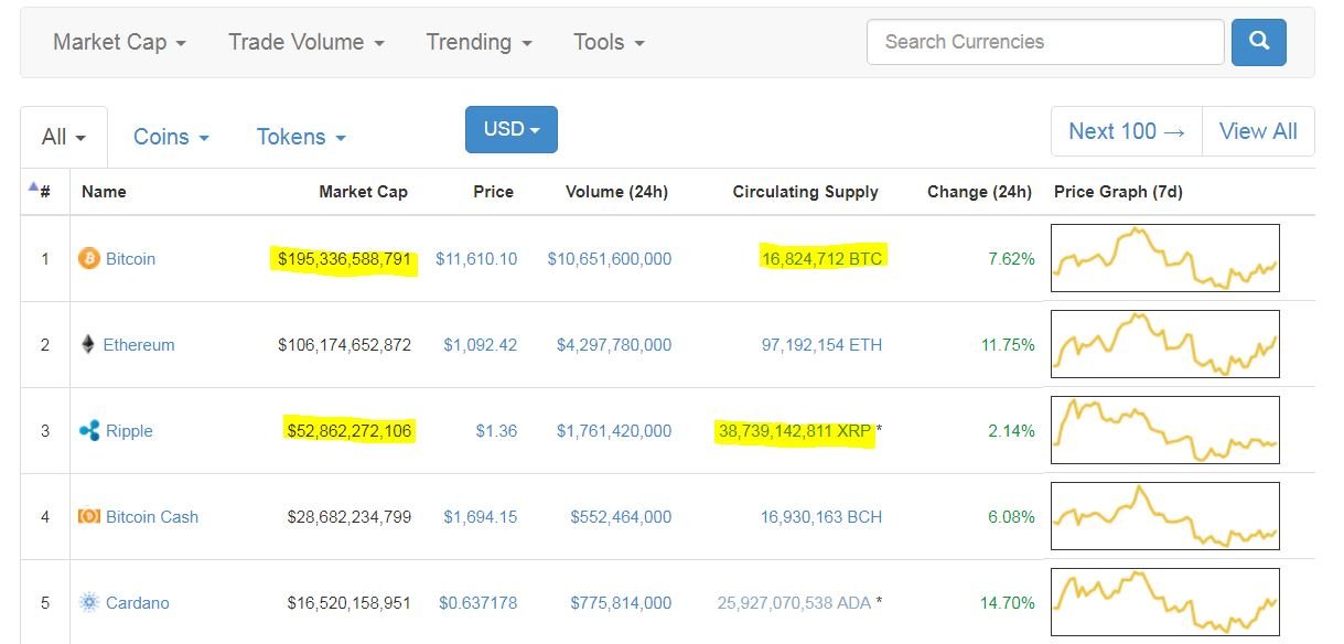 Market cap is figured by (circulating supply x price = market cap). I use the market cap of $250B to figure out the future price at constant supply, but you can set your own standard. Take 250B and divide by the supply, that is your price estimate if the asset ever reaches a quarter-billion dollar market cap. Logically then, if the supply of coins is high, the price will be low. (if Ripple had a supply as low as Bitcoin, its price at that market cap would be around $3000).