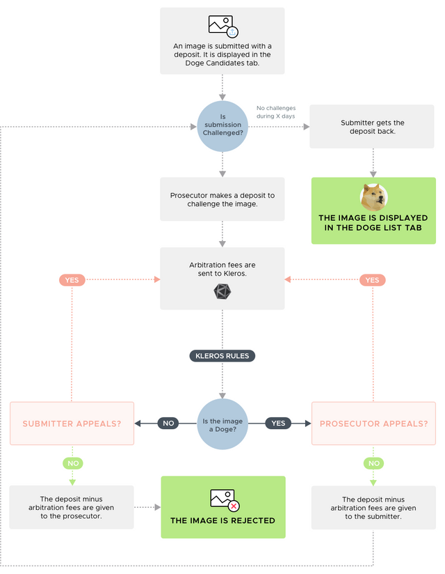 Kleros has launched a testing model system experiment called "Doges", in which exemplifies 3 possible roles for users:- Submitter: Send images and try to be accepted in the list. You must pay a deposit fee in ETH.