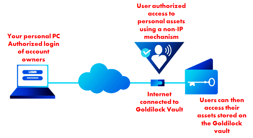 Through an authorized non-IP mechanism, users will only have access to their secured assets via Public Switch Telephony Network which will only be accessible through an authorized login platform of the user. When the user is done with whatever information he/she needs to retrieved, the GOLDILOCK automatically disconnect from the Internet creating an air gap between the Internet and the Goldilock vault and cannot be accessed by other users. It is worth knowing that GOLDILOCK has no access to users or clients’ personal data.