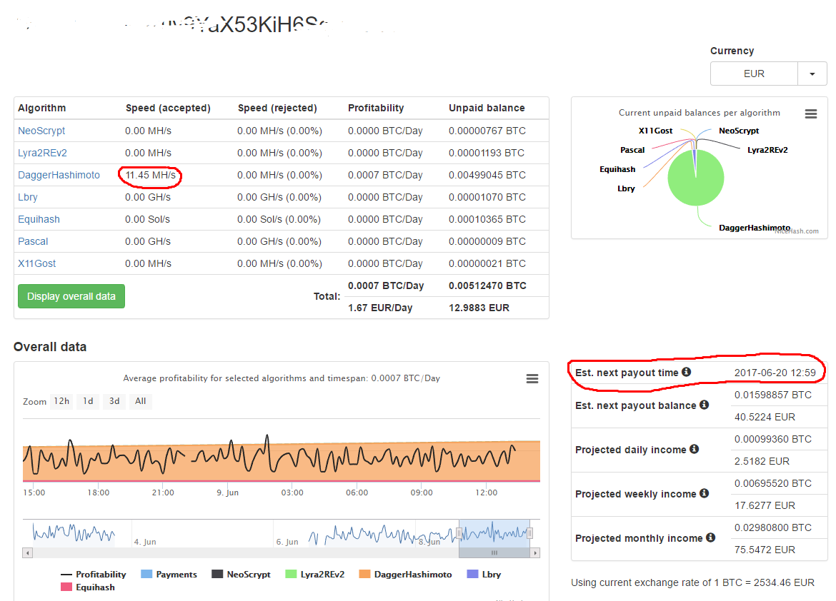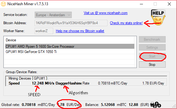 Here you can check you mining speed and what algorithm your mining. After a few minutes you can check your stats by klicking on the link "Check my stats online"