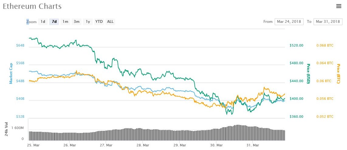 Ethereum (ETH) is also in the green, up almost 3 percent over a 24 hour period and trading at around $406 by press time, up from a 24-hour low of $371.