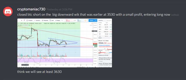btc went up to 3580 and anow is sitting at 3560 area, still thinking it will see higher levels above 3600 before it goes down