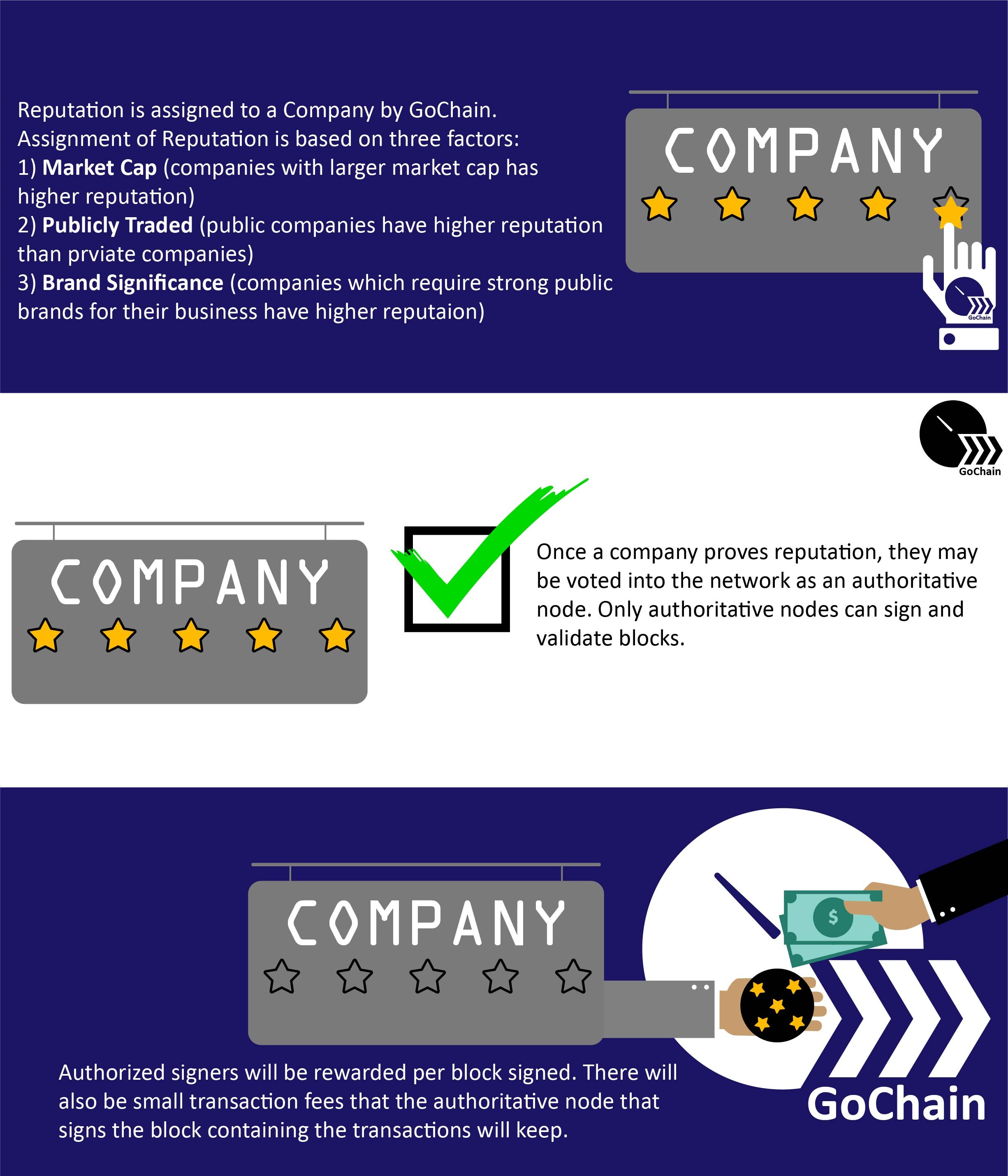 I then made a comic to show how the Proof of Reputation works GoChain assigns reputation to a company. This is based on some factors such as Market Cap, Publicly traded, brand significance. It is explained in the design below. Once the company has proved its reputation, the company can be voted as an authorized node. For every block signed, authorized nodes are rewarded with the GoChain (GOC) token.