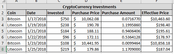 This spreadsheet has an input tab and a reporting dashboard so that I can see my position on a coin by coin basis. The input tab (bottom screenshot), allows me to input each of my investments as the transaction is made. I enter the coin that I purchased, the date I made the purchase, the total amount I invested (inclusive of fee), the purchase price, and the purchase amount for the transaction. Note: all information can easily be copy/pasted from the Coinbase receipt that gets emailed to you. The last column in this tab is the effective price. A fee is charged on every transaction. The amount is dependent on whether you used a credit card to make the transaction or if you used a bank account. In order for you to calculate your break-even price, you need to account for the price you paid for the coin plus the fee incurred. In my spreadsheet, I call this the effective price (the price paid if you take into account the fee). If you purchase your coin with a credit card (as I have in my examples), you can see the difference in purchase price and the effective price. This tells me that, even though I purchased Bitcoin at 10,060, I cannot sell it at 10,200 or I will not cover my transaction costs.