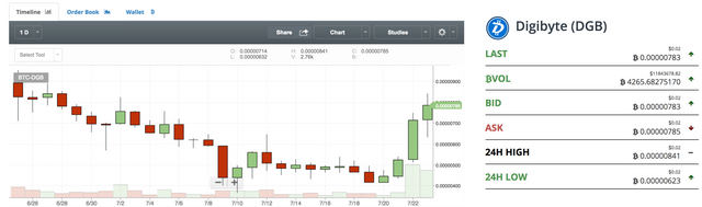 On July 19th I felt like it was the right time to buy back into DGB, so I scooped some back up at 0.00000512 per.