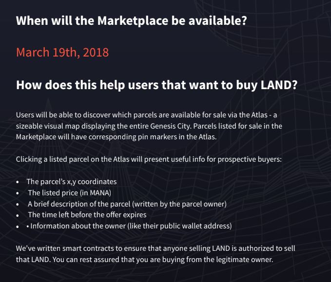 Essentially Decentraland’s Land Marketplace, which was made available on the 19/03, acts as a hub where people will be able to ‘buy’ and ‘sell’ land (which until this point has been done through trusted community members acting as escrows based on ‘random’ prices). However, rather than read a drawn-out response which lacks in technical aptitude from myself, check out Decentraland’s very own outline: