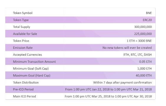 As a platform that anchored on the functionalities of the Blockchain technology, the ecosystem will function with the usage of the token. The token that will be employed to interconnect and interrelate with each other within the ecosystem will be the BNE token. The diagram below gives a summary of the token as well as ICO dates and type.
