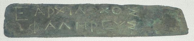 "In ancient Greece, a pinakion was a small bronze plaque used to identify a citizen of a city. Pinakia for candidates for political office or for jurors were inserted into randomization machines (kleroteria)." Source