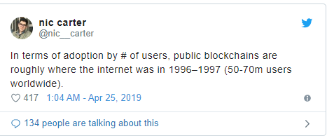 Nic Carter, a partner at Castle Island Ventures and co-founder of Coinmetrics, recently remarked that the number of consumers utilizing public blockchains currently equals that of the Internet in 1997, at 50 to 70 million users. And out of those 60-odd million, likely only a few million are actively involved in Bitcoin’s and crypto’s day-to-day happenings. This statistic, according to Carter, begs the pertinent question: Why did we have such a large bubble in 2017, when the first notable Dotcom bubble occurred at 300 million users?