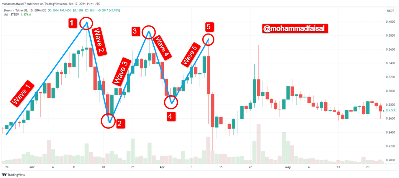 STEEM/USDT Example: If STEEM has been in a long downtrend then wave 1 could be a small upward move. It happens most probably with the positive news or a slight change in market sentiment.