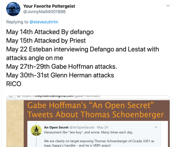 This appears to be Donna's "evidence" that Jack = TS. An account on YouTube called "Schoenberger's Cat" made a comment "I am indeed proud to be Thomas Schoenberger".