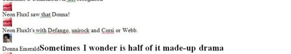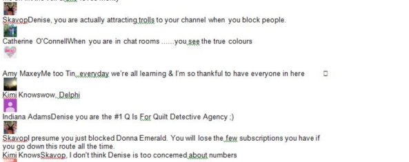 In this YouTube chat, the "Donna Emerald" character gets blocked and immediately "skavop" appears to defend her.
