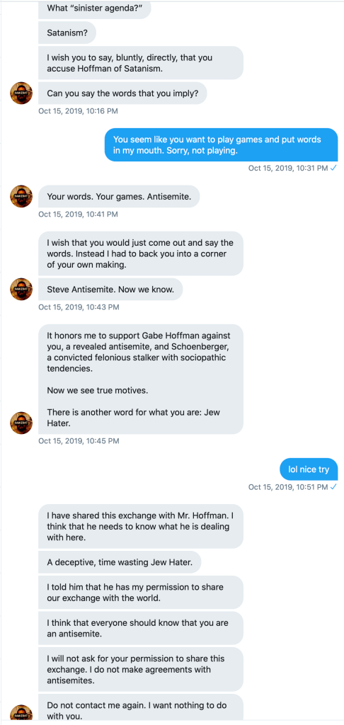 His statement that he wanted nothing to do with me is belied by his frequent name-calling and promotion of falsehoods about me ever since.