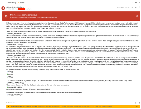 Of all the emails and attachments A858 sent to me, only one caused a problem. A virus and phishing error I've never seen before, warning "This Message Seems Dangerous" and contained links to a malicious site hosting malware. The email contained only one link: to what appeared to be Esteban's twitter account.