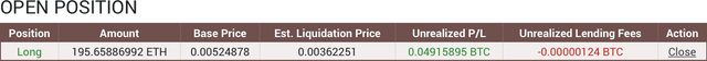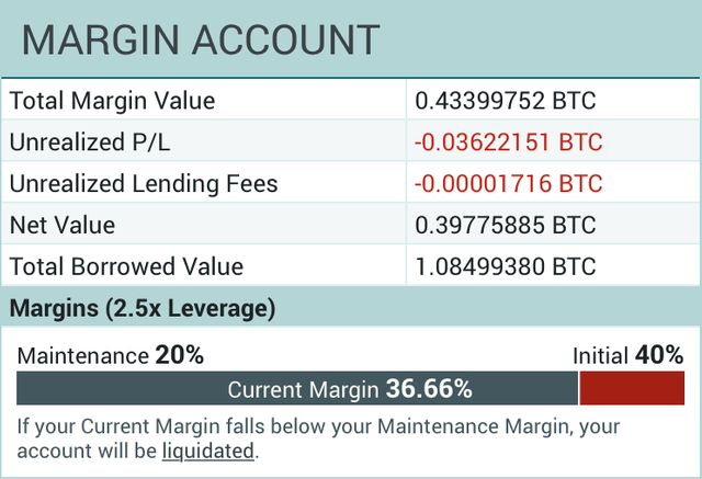 -Current Margin: The percentage of your Total Borrowed Value that your Net Value currently is (in other words, Net Value over Total Borrowed Value). Current Margin is a critical value, because if it dips below your Maintenance Margin, your account will undergo a forced liquidation. For example, suppose you have 1.5 BTC in your margin account, and your -Maintenance Margin is 20%. Borrowing 3 BTC, you open a long position in the XMR market. Now, in order to avoid a forced liquidation, the Net Value of your margin account must remain above 20% of the 3 BTC you just borrowed, or 0.6 BTC. If the price of XMR starts declining, the amount of BTC you can get by selling the XMR you just purchased diminishes, and you start to incur a loss. This is reflected in your P/L and Net Value. If the amount of this loss, together with the lending fees you owe, reaches 0.9 BTC, the net value of your margin account will be 0.6 BTC (1.5 BTC minus 0.9 BTC in unrealized losses) and a forced liquidation will trigger.