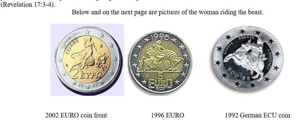 How in the world could Jesus know some 2,000 years ago that one single generation would have a cashless system? He would have to be God to know this. But wait there is one other very specific item I want to show you. Did you know Jesus also told us we would see a women riding a beast and, this women would come out of the new revived Roman Empire. Guess what? The EU (European Union) is made up of the exact same nations as was the first Roman Empire. Can you guess what symbol the EU has taken to represent the EU? Answer: a women riding a beast. Go to dimoraministry.com and download for free Frank DiMora’s prophecy book entitled: The Last Chronicles of Planet Earth. On page 63-65 you will see all the photos of the women riding on the beast.