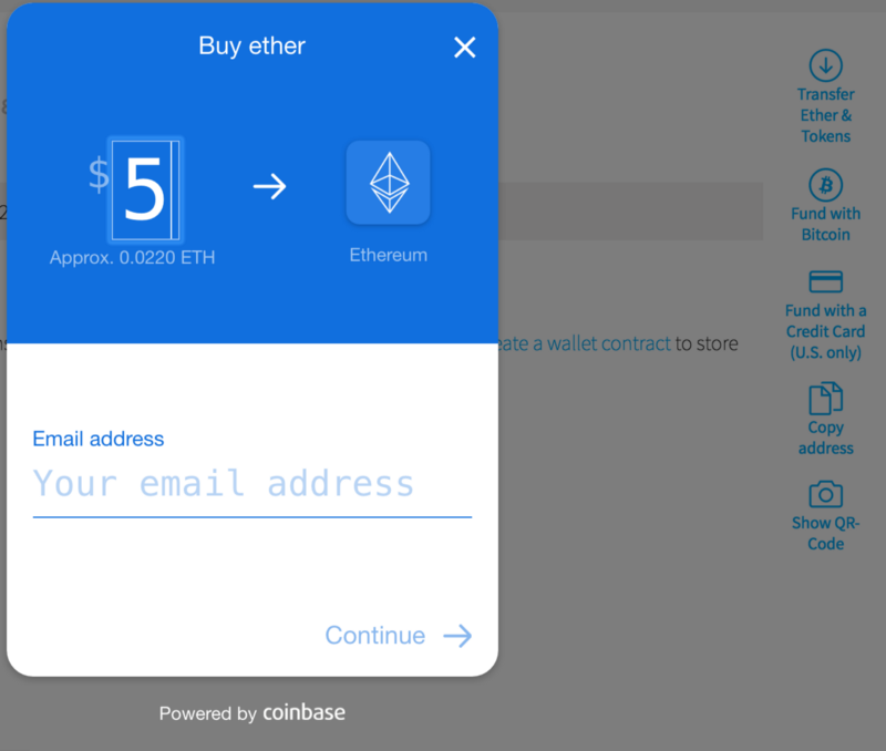 4. Either a) send ether/ETH that you already have to the account, or b) purchase some ether. For b), I recommend using the built-in Coinbase buy widget, which you can access by clicking on the Fund with a Credit Card button within an account.
