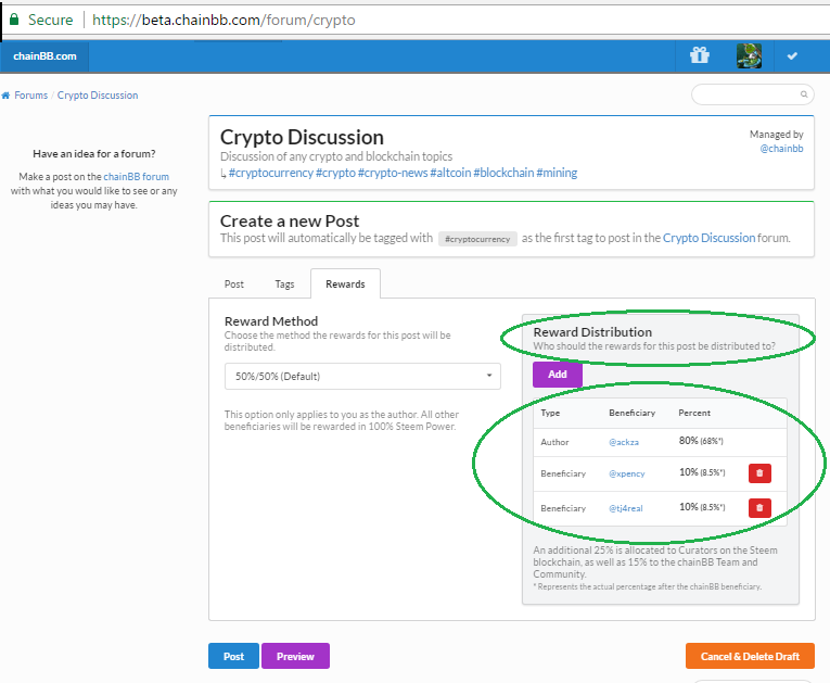 Pretty cool right? can't do that in regular steemit ;) Maybe one day! but its cool to let someone else automatically get paid from a portion of your post rewards! You just click "Add" and type in their name and a number of the percent you wanna share! I just gave them 10 each! i like to show people I did it so let them know and let the community see this cool na feature most of us don't even know exists! (Most don't even know about ChainBB or that it is actually just steemit, login with steemit username and your "Posting Key" one of your four passwords (used for posting posts and comments etc) found in Wallet > Permissions And thats it! You can find alot of cool stuff on steemit using chainBB! Create your own SubSteemit like reddit has SubReddits !