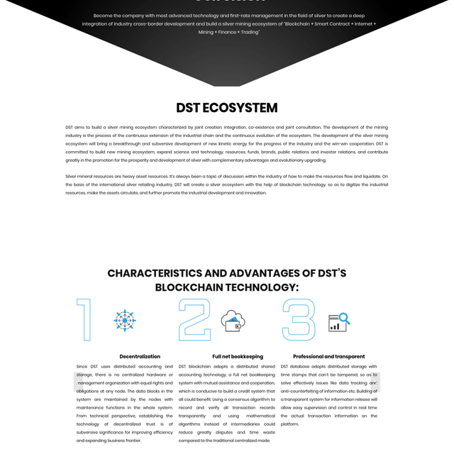 DST is a decentralized silver ecosystem with underlying blockchain technology, utilizing smart contract protocol to allow traditional silver mining industrial to digitize the industrial resources, increase assets circulation and production efficiency, as well as increasing the credibility of quality assurance through credible and sophisticated verification process and warranty card certification.