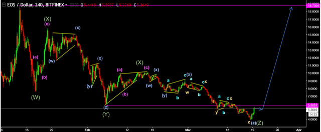 EOS broke the low (purple line) and finished WXYXZ correction. This cryptocurrency today made one of strongest momentum upside, so I do think reverse upside has already started!
