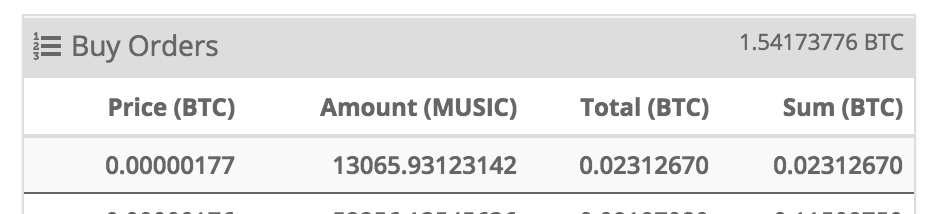 So from the above example we can see that the cheapest anyone is willing to sell their $MUSIC for is 0.00000179 BTC and the cheapest anyone is willing to buy them for is 0.00000177 BTC. The difference is referred to in traditional financial markets as the "bid/offer" spread.
