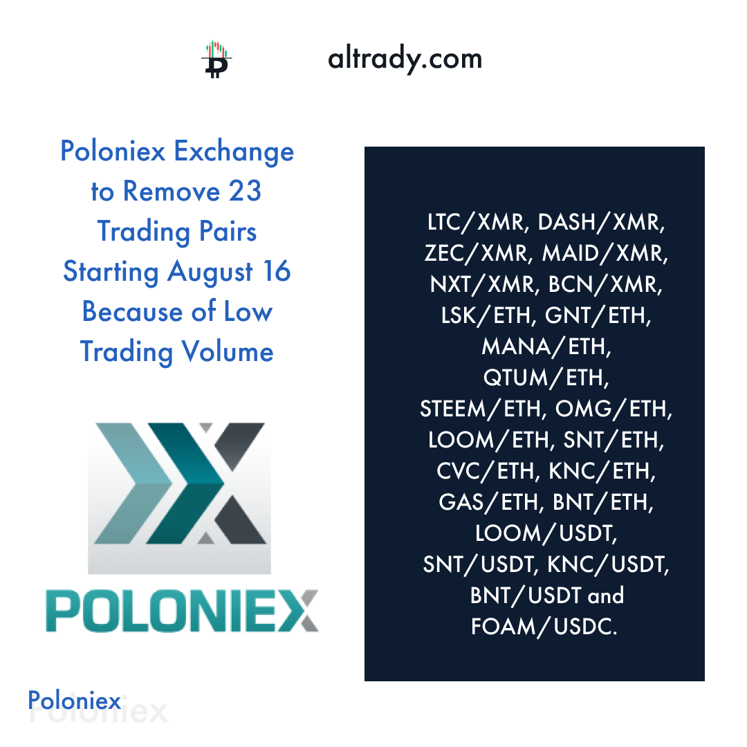 - Poloniex to Delist 23 Cryptocurrency Trading Pairs Because of Low Volume