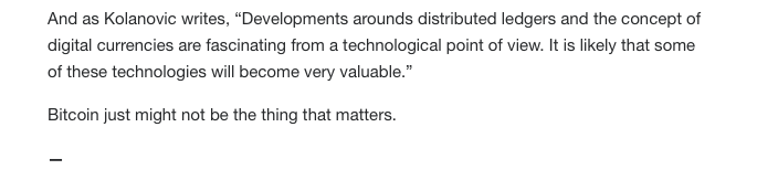 This is not the first time we have heard critical attacks on digital currency, especially Bitcoin. However, personally this is the first time I have heard cryptocurrency being compared to that of a pyramid scheme. Do I agree? No, I think they are many gaps in the some of Kolanovic's logic. However, his claim is quite interesting, and he addresses some amusing points, but with a carping attitude. Using words such as "fraudulent", and calling crypto investors "Uniformed" and "stupid", it definitely strikes a nerve with many of us. As stated, since Bitcoin and other related technologies are going to undermine the primacy of the entire banking system, of course someone like him is going to dismiss it.