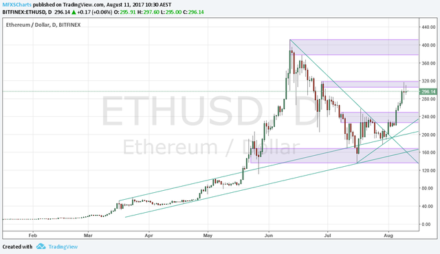 The ETHUSD rally is on pause for the moment, but it did trade significantly higher since my last post. Pair is currently consolidating under 320 resistance and seems to be preparing for a move higher. I'm still not sure if it can breach the highs and resume the up-trend though - not a harmonics guy, but this looks like one of those bearish animal structures - would like to hear from any techies out there who specialize in harmonics. Either way I think we should see a return to the highs: