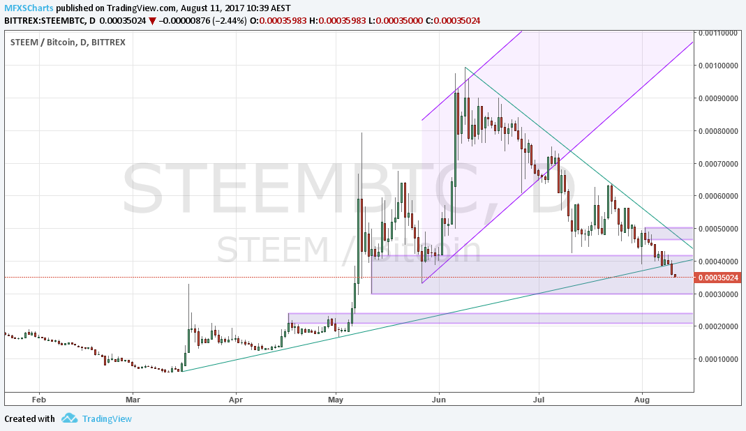 STEEMBTC has broken below trend-line support, though the lower bound of the 30-40 support zone still holds, and recent weakness is on the back of Bitcoin strength - this is far from the doomsday scenario we were worried about in late July. I still see potential for a bounce from this support zone, though let's face it - my bullish calls have been pretty shocking on this pair :P