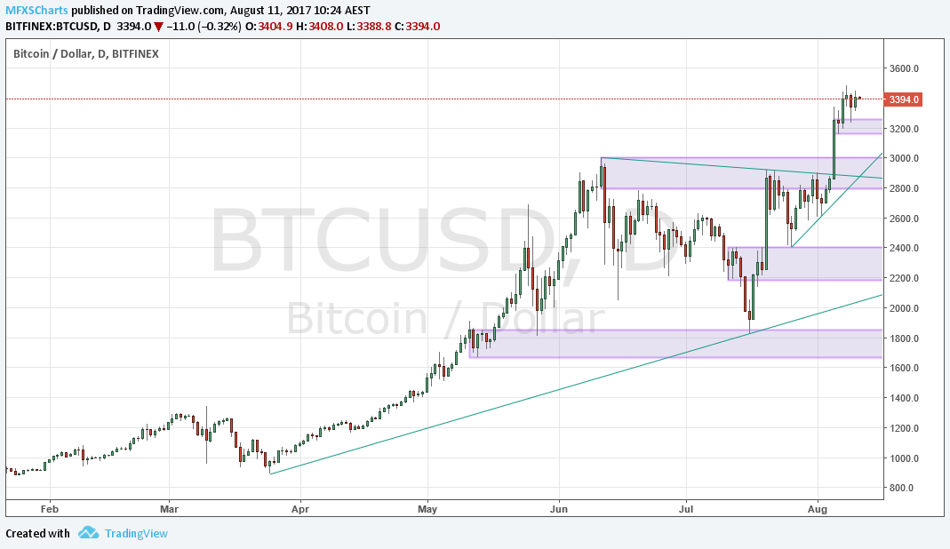 BTCUSD finished the day higher yesterday, rallying out of short term support in the 3150-3250 zone, to close at 3405. That is just shy of the record close at 3415. This is a welcome development as Wednesday was a Bearish Engulfing candle that could of led to a sharp sell off. Not out of the woods yet though, that reversal candle is still dangerous as long as the highs hold. Would like to see it invalidated over the coming days: