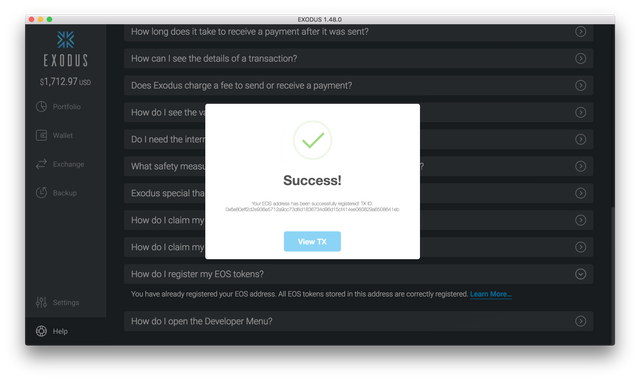 After confirmation, Exodus will handle the entire registration in the background and your EOS address will finally be registered! After this you are brought to the final dialogue and you will be shown the Transaction ID of your registration which is easily verified by clicking "View TX".