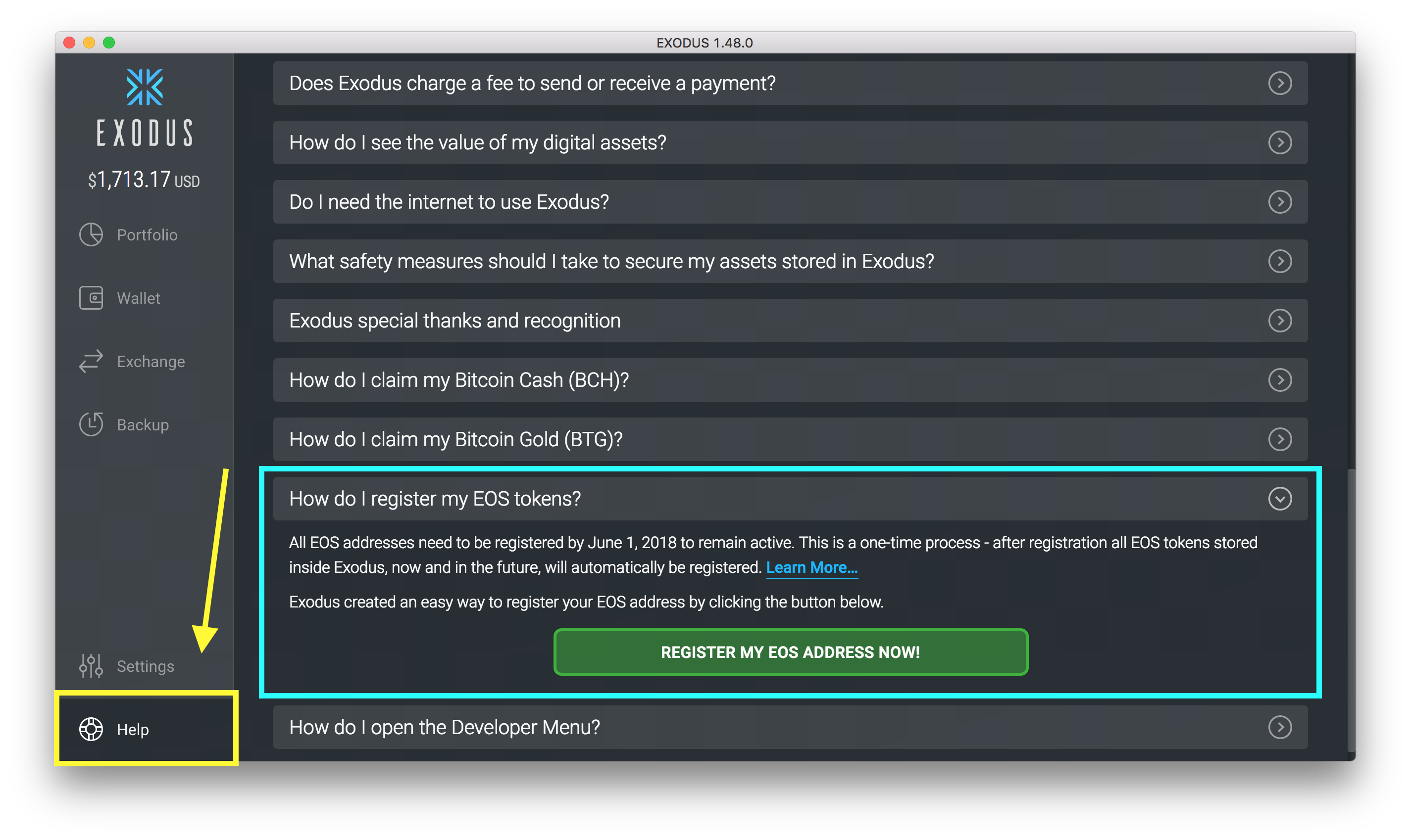 If you have claimed BTG or BCH (BTC forks) from Exodus before this process is very similar. Scroll down and click on the entry which is named EOS registration.