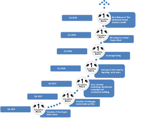 Thirdly, we will develop use-cases for the Crypto Mark. In the beginning, this might involve shops accepting only a certain part of a purchase in Crypto Mark, but once the value of the Crypto Mark becomes more visible via exchange listings, we expect shops to move to a full acceptance of Crypto Mark. We will support shops with marketing support such as a listing on our webpage etc.