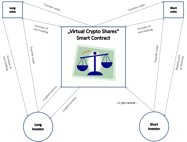 For the investor interested in buying shares, “long tokens” will be issued in relation to the value (e.g. in Ether) he invests. The money will however stay in the smart contract (without any crypto shares being issued) in the smart contract, until another investor is willing to bet on declining share prices. This short investor will also need to pay a margin into the account. Once the two amounts match short and long crypto shares will be issued to the long and the short investor.
