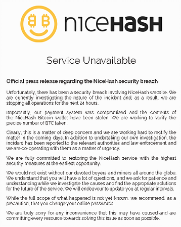 The members of the Nicehash.com team reported that their cryptocurrency hash power renting service website was hacked. On December 6, they posted on social network that their security system was breached after which the wallets of this website were robbed.