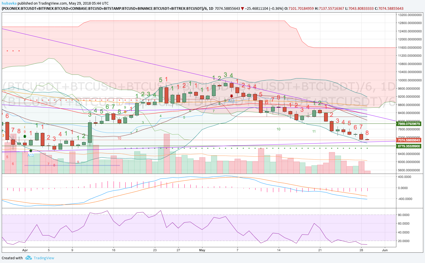 The slow grind down continues. I was expecting a quick dump under $7,200, but there is a lot of bids supporting the price and the selling is still orderly. TD is on red 8 and tomorrow we might see a reversal based on this indicator. MACD trending down, RSI staying at oversold levels. Price is very close to the big trend line. For today the trend line comes at $6,960. All timeframes are bearish again.